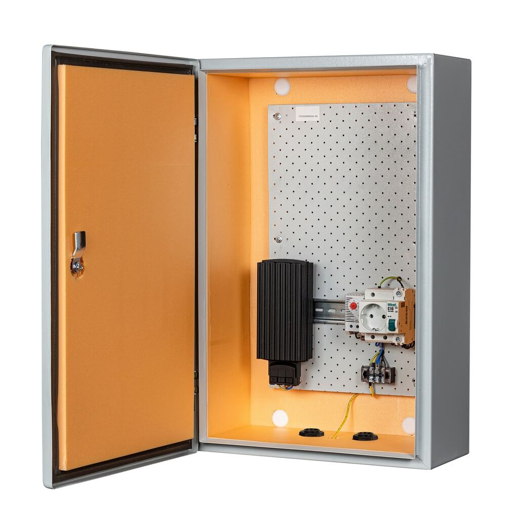 Климатический монтажный шкаф предназначен для установки оборудования с необходимостью соблюдения температурного режима. Степень защиты IP66. Комплектация: утеплитель, замок, ключ, монтажная плата, 2 гермоввода, розетка, автоматический выключатель, термореле, нагреватель 75Вт, уплотнительная прокладка. Габаритные размеры внешн./внутр 360х560х190мм./320х520х130мм