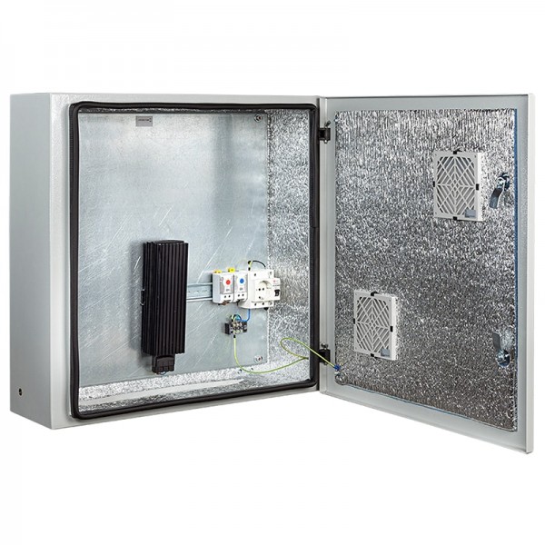 Климатический монтажный шкаф предназначен для установки оборудования с необходимостью соблюдения температурного режима и влажности. Степень защиты IP54. Комплектация: замок 2 шт, ключ, монтажная плата, 2 гермоввода, розетка, авт. выключатель, термореле, реле предстарта, нагреватель 150Вт, вентиляционные панели, уплотнительная прокладка. Габаритные размеры внешн./внутр. 600х600х210мм./570х570х150мм.