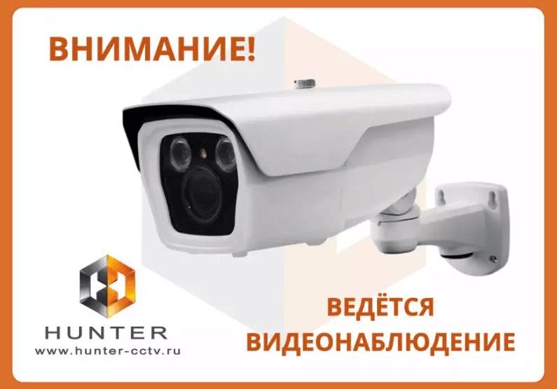 Наклейка с надписью "Ведется видеонаблюдения". Выполнена на матовой бумаге с клейкой основой. Присутсвует логотип "Hunter". Размеры 148,5х210 мм